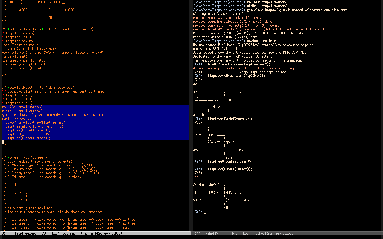 1. `eepitch-maxima'I use eepitch to send lines from Emacs to Maxima; see the figure below for the main idea, and my presentation at the EmacsConf2021 for the details. The definition of eepitch-maxima in eev is the simplest possible - just this: