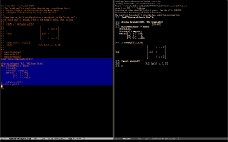 The fourth screenshot shows this library for (joined) lerps. 7. Embedding in LaTeXMy current way of LaTeXing Maxima code uses Lpeg. Its main module is here, Maxima2.lua, and it produces output like this from this input (plus tweaking). The rest of this section describes an older way. Here is an example of how I am embedding Maxima code in LaTeX files; the trick that makes eepitch ignore a prefix is explained here. If I execute that eepitch block skipping the lines "load" and "display2d" I get a human-friendly output, as in the first screenshot below; if I execute the lines "load" and "display2d" I get an output that I can process with M-x emaxima-conv (that calls emaxima.lua) to obtain this LaTeX code, that becomes this in the PDF. This trick is based on the answers that I got for this question that I sent to Maxima mailing list; note that 1) I am using this copy of emaxima.sty that has two lines commented out, and 2) my emaxima.lua is a quick hack, and it should be converted to elisp at some point. 7.1. LaTeX instead of TeXBy default Maxima generates TeX code that is TeX-y instead of LaTeX-y - for example, if you don't change anything then `tex1(matrix([42]))' returns this: