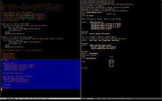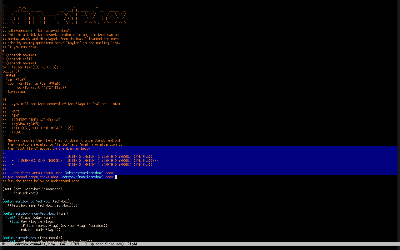 ...and then run the tests and examples in its test blocks. The next sections explain what its tests and examples do. 3. The core: edrxbox.lispThe file edrxbox.lisp has lots of explanations, and it has only a handful of (boring) test blocks that demonstrate low-level things... these ones, starting on the second screenshot: It also has lots of links to displm.lisp and displa.lisp. To make them work in Emacs you need a `code-c-d' like this one: