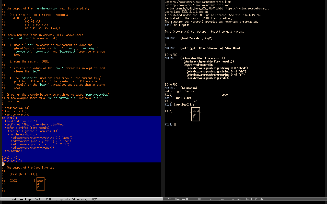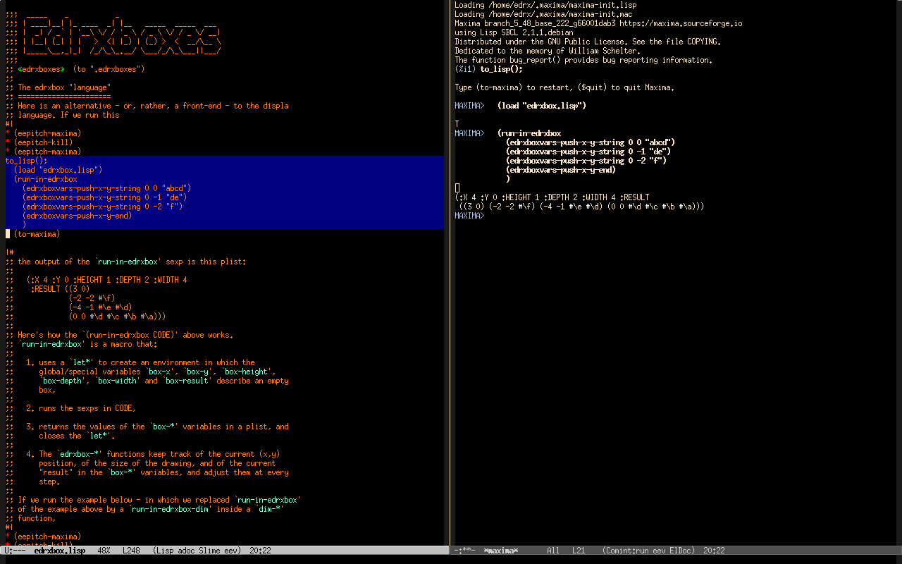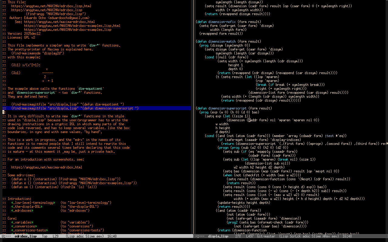 In Emacs they will point to specific lines in the Maxima source, like in this screenshot: but in the htmlized version of edrxbox.lisp their pos-spec-lists don't work, and the links point to the top of the files in the git repository. 4. The examples: edrxbox-examples.lispThe file edrxbox-examples.lisp is much more interesting... it has these examples: 4.1. VerbatimboxVerbatimbox is used by lisptree: Note what was needed to center the drawing around the baseline - just a call to `edrxbox-vcenter', that added a "move" command to the drawing instructions. 4.2. AntiderivThe first two screenshots below show `antideriv' and `hdw'. `hdw' creates a box with a certain height, depth, and width; I use it mostly to debug `dim-*' functions. The third screenshot below shows a comparison between the `antideriv' written with edrxbox and its antecessor, dim-antideriv.lisp: 4.3. UnderbraceThe next screenshot shows `underbrace' - note how the horizontal centering was done by just calling `edrxbox-hcenter' - and a demo that uses my substitution operator, `_s_', and these variants of it. The second screenshot shows how these underbraces are LaTeXed - see the introduction. 4.4. Displaying edrxboxesRemember that in a previous section we saw a debugging function, `edrxbox-from-form', that displays the drawing instructions for a given Maxima object. Here is its screenshot again: The next example is another debugging function, `edrxbox-display', that receives an edrxbox, converts its drawing instructions into a Maxima object - whose associated `dim-*' function is `dim-edrxbox' -, and makes Maxima display it. The conversion is explained in the first two screenshots below, ...and the third screenshot shows what can happen when we don't run `edrxboxvars-push-x-y-end' to move the current (x,y) position to the "right" ending place. This is related one of my motivations for writing edrxbox.lisp, by the way... see this bug report, that describes a similar bug that took us months to fix, and the explanations in the beginning of edrxbox.lisp, that have this paragraph:
