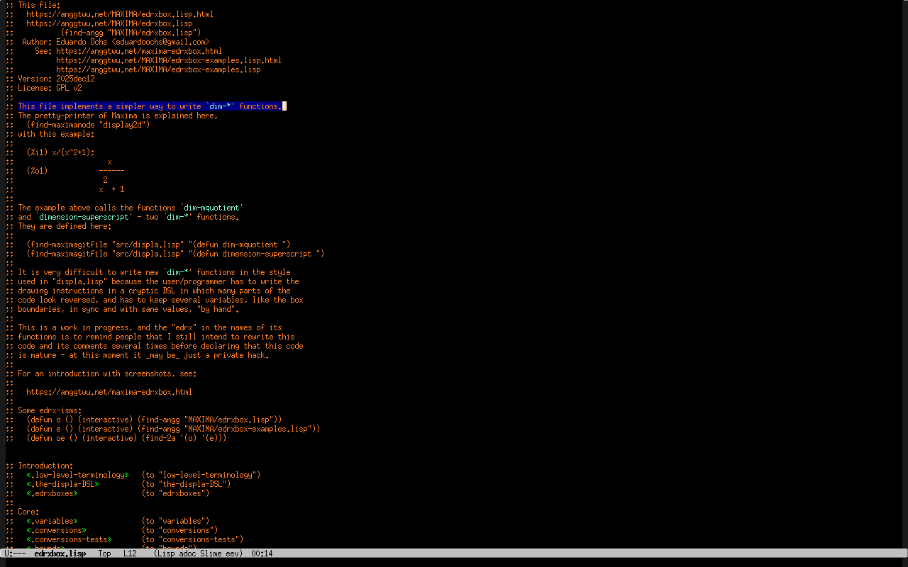 1. What is this?In Maxima we can define operations that are displayed and LaTeXed in special ways. Making `underbrace(a,b)' be LaTeXed as `\underbrace{a}_{b}', as in the first screenshot below, is very easy; making it be displayed as in the second screenshot, as something that looks vaguely like a fraction but in which the baseline is the baseline of the top object, is VERY hard. Look at this bug report, for example - it took me ages to understand dim-antideriv.lisp, and more ages to find a one-line fix that fixed its behavior in most cases. We need something better, like another way to write display functions... and I think that this is a step in the right direction. 2. Try it!If you have eev installed and activated - and Maxima, of course - you can try edrxbox by downloading its two files, edrxbox.lisp and edrxbox-examples.lisp, with something like these commands...